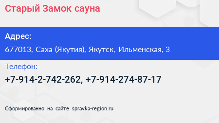 Старый Замок, сауна по адресу 677013, Саха (Якутия), Якутск, Ильменская, 3 в дальнейшем Организация, размещена в следующих категориях: