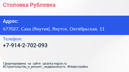 Столовка Рублевка по адресу 677027, Саха (Якутия), Якутск, Октябрьская, 11 в дальнейшем Организация, размещена в следующих категориях: