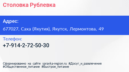 Столовка Рублевка по адресу 677027, Саха (Якутия), Якутск, Лермонтова, 49 в дальнейшем Организация, размещена в следующих категориях: