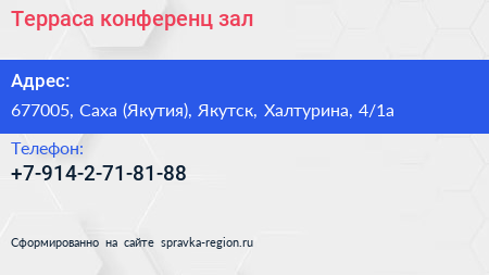 Терраса, конференц-зал по адресу 677005, Саха (Якутия), Якутск, Халтурина, 4/1а в дальнейшем Организация, размещена в следующих категориях: