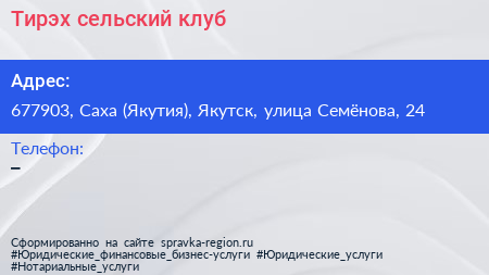 Тирэх, сельский клуб по адресу 677903, Саха (Якутия), Якутск, улица Семёнова, 24 в дальнейшем Организация, размещена в следующих категориях: