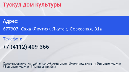 Тускул, дом культуры по адресу 677907, Саха (Якутия), Якутск, Совхозная, 31а в дальнейшем Организация, размещена в следующих категориях: