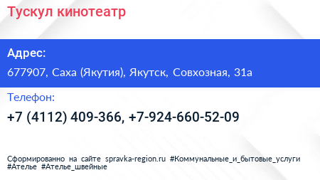 Тускул, кинотеатр по адресу 677907, Саха (Якутия), Якутск, Совхозная, 31а в дальнейшем Организация, размещена в следующих категориях:
