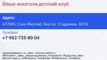 Юные искатели, детский клуб по адресу 677005, Саха (Якутия), Якутск, Стадухина, 83/3г в дальнейшем Организация, размещена в следующих категориях: