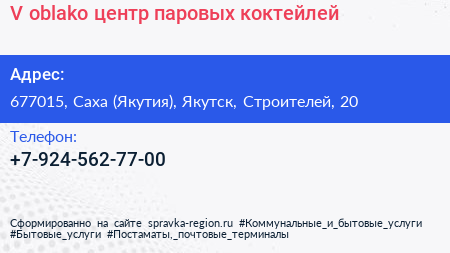 V oblako, центр паровых коктейлей по адресу 677015, Саха (Якутия), Якутск, Строителей, 20 в дальнейшем Организация, размещена в следующих категориях: