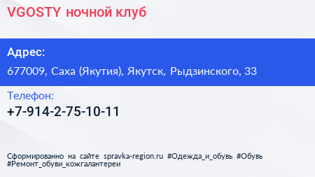 VGOSTY, ночной клуб по адресу 677009, Саха (Якутия), Якутск, Рыдзинского, 33 в дальнейшем Организация, размещена в следующих категориях: