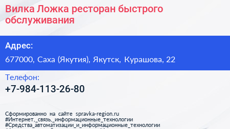 Вилка-Ложка, ресторан быстрого обслуживания по адресу 677000, Саха (Якутия), Якутск, Курашова, 22 в дальнейшем Организация, размещена в следующих категориях: