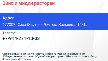 Вино и мидии, ресторан по адресу 677009, Саха (Якутия), Якутск, Кальвица, 14/1а в дальнейшем Организация, размещена в следующих категориях: