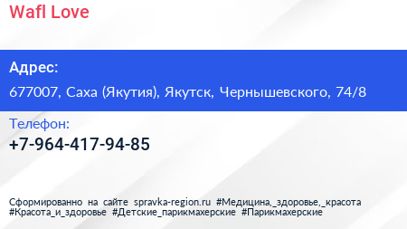 Wafl Love по адресу 677007, Саха (Якутия), Якутск, Чернышевского, 74/8 в дальнейшем Организация, размещена в следующих категориях:
