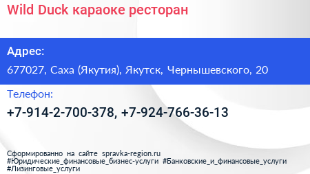 Wild Duck, караоке-ресторан по адресу 677027, Саха (Якутия), Якутск, Чернышевского, 20 в дальнейшем Организация, размещена в следующих категориях: