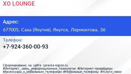 XO LOUNGE по адресу 677005, Саха (Якутия), Якутск, Лермонтова, 36 в дальнейшем Организация, размещена в следующих категориях: