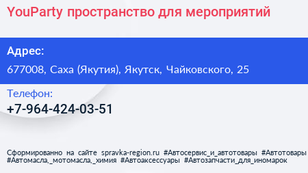 YouParty, пространство для мероприятий по адресу 677008, Саха (Якутия), Якутск, Чайковского, 25 в дальнейшем Организация, размещена в следующих категориях: