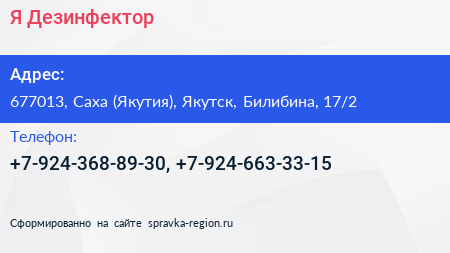 Я Дезинфектор по адресу 677013, Саха (Якутия), Якутск, Билибина, 17/2 в дальнейшем Организация, размещена в следующих категориях: