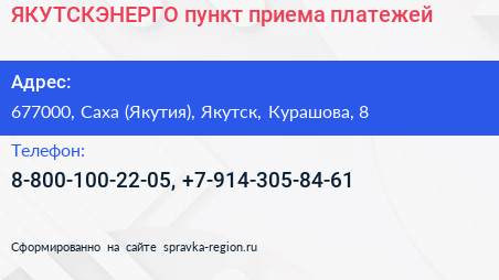 ЯКУТСКЭНЕРГО, пункт приема платежей по адресу 677000, Саха (Якутия), Якутск, Курашова, 8 в дальнейшем Организация, размещена в следующих категориях: