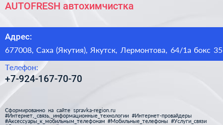 AUTOFRESH, автохимчистка по адресу 677008, Саха (Якутия), Якутск, Лермонтова, 64/1а бокс 35 в дальнейшем Организация, размещена в следующих категориях: