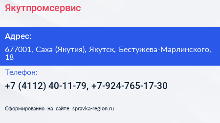 Якутпромсервис по адресу 677001, Саха (Якутия), Якутск, Бестужева-Марлинского, 18 в дальнейшем Организация, размещена в следующих категориях: