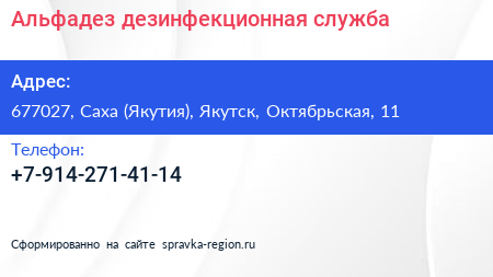 Альфадез, дезинфекционная служба по адресу 677027, Саха (Якутия), Якутск, Октябрьская, 11 в дальнейшем Организация, размещена в следующих категориях: