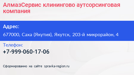 АлмазСервис, клинингово-аутсорсинговая компания по адресу 677000, Саха (Якутия), Якутск, 203-й микрорайон, 4 в дальнейшем Организация, размещена в следующих категориях: