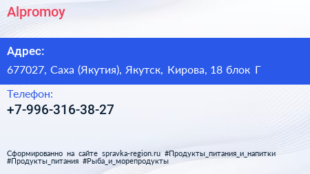 Alpromoy по адресу 677027, Саха (Якутия), Якутск, Кирова, 18 блок Г в дальнейшем Организация, размещена в следующих категориях: