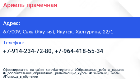 Ариель, прачечная по адресу 677009, Саха (Якутия), Якутск, Халтурина, 22/1 в дальнейшем Организация, размещена в следующих категориях: