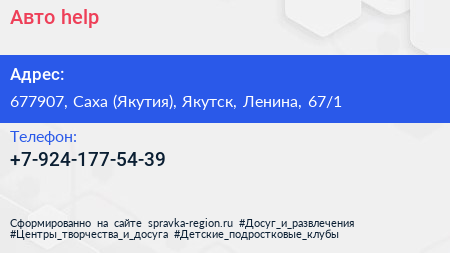 Авто help по адресу 677907, Саха (Якутия), Якутск, Ленина, 67/1 в дальнейшем Организация, размещена в следующих категориях: