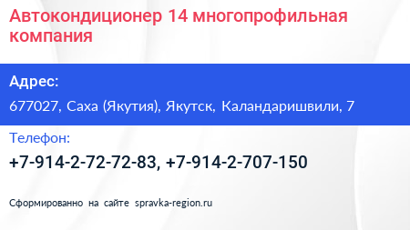 Автокондиционер 14, многопрофильная компания по адресу 677027, Саха (Якутия), Якутск, Каландаришвили, 7 в дальнейшем Организация, размещена в следующих категориях: