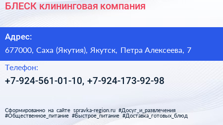БЛЕСК, клининговая компания по адресу 677000, Саха (Якутия), Якутск, Петра Алексеева, 7 в дальнейшем Организация, размещена в следующих категориях: