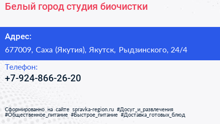 Белый город, студия биочистки по адресу 677009, Саха (Якутия), Якутск, Рыдзинского, 24/4 в дальнейшем Организация, размещена в следующих категориях: