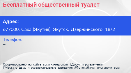 Бесплатный общественный туалет по адресу 677000, Саха (Якутия), Якутск, Дзержинского, 18/2 в дальнейшем Организация, размещена в следующих категориях: