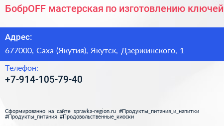 БобрOFF, мастерская по изготовлению ключей по адресу 677000, Саха (Якутия), Якутск, Дзержинского, 1 в дальнейшем Организация, размещена в следующих категориях: