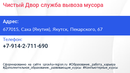 Чистый Двор, служба вывоза мусора по адресу 677015, Саха (Якутия), Якутск, Пекарского, 67 в дальнейшем Организация, размещена в следующих категориях: