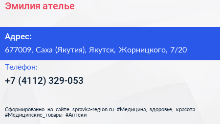 Эмилия, ателье по адресу 677009, Саха (Якутия), Якутск, Жорницкого, 7/20 в дальнейшем Организация, размещена в следующих категориях: