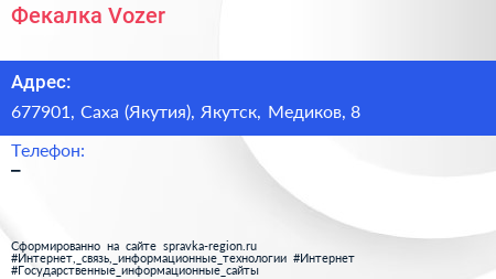 Фекалка Vozer по адресу 677901, Саха (Якутия), Якутск, Медиков, 8 в дальнейшем Организация, размещена в следующих категориях: