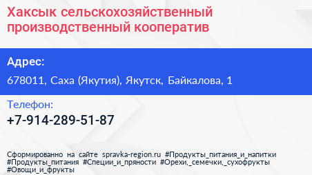 Хаксык, сельскохозяйственный производственный кооператив по адресу 678011, Саха (Якутия), Якутск, Байкалова, 1 в дальнейшем Организация, размещена в следующих категориях: