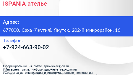 ISPANIA, ателье по адресу 677000, Саха (Якутия), Якутск, 202-й микрорайон, 16 в дальнейшем Организация, размещена в следующих категориях: