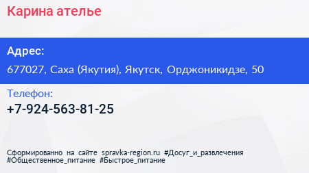 Карина, ателье по адресу 677027, Саха (Якутия), Якутск, Орджоникидзе, 50 в дальнейшем Организация, размещена в следующих категориях: