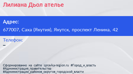 Лилиана-Дьол, ателье по адресу 677007, Саха (Якутия), Якутск, проспект Ленина, 42 в дальнейшем Организация, размещена в следующих категориях: