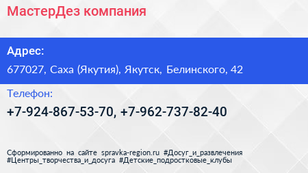 МастерДез, компания по адресу 677027, Саха (Якутия), Якутск, Белинского, 42 в дальнейшем Организация, размещена в следующих категориях: