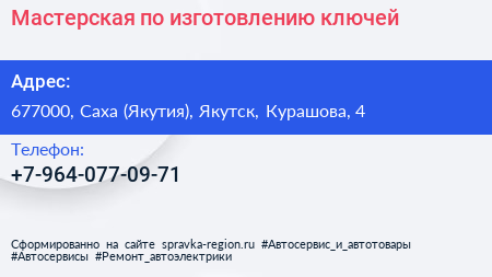 Мастерская по изготовлению ключей по адресу 677000, Саха (Якутия), Якутск, Курашова, 4 в дальнейшем Организация, размещена в следующих категориях:
