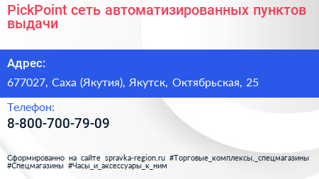 PickPoint, сеть автоматизированных пунктов выдачи по адресу 677027, Саха (Якутия), Якутск, Октябрьская, 25 в дальнейшем Организация, размещена в следующих категориях: