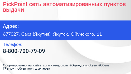 PickPoint, сеть автоматизированных пунктов выдачи по адресу 677027, Саха (Якутия), Якутск, Ойунского, 11 в дальнейшем Организация, размещена в следующих категориях: