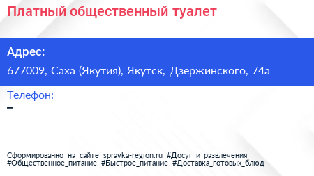 Платный общественный туалет по адресу 677009, Саха (Якутия), Якутск, Дзержинского, 74а в дальнейшем Организация, размещена в следующих категориях: