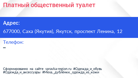 Платный общественный туалет по адресу 677000, Саха (Якутия), Якутск, проспект Ленина, 12 в дальнейшем Организация, размещена в следующих категориях:
