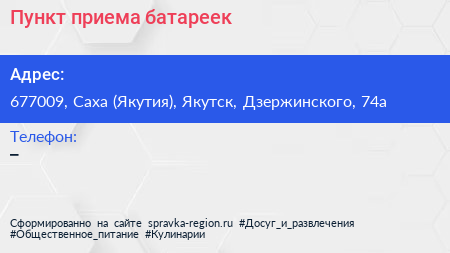 Пункт приема батареек по адресу 677009, Саха (Якутия), Якутск, Дзержинского, 74а в дальнейшем Организация, размещена в следующих категориях: