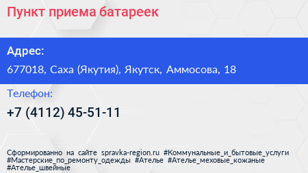 Пункт приема батареек по адресу 677018, Саха (Якутия), Якутск, Аммосова, 18 в дальнейшем Организация, размещена в следующих категориях: