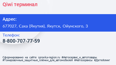 Qiwi, терминал по адресу 677027, Саха (Якутия), Якутск, Ойунского, 3 в дальнейшем Организация, размещена в следующих категориях: