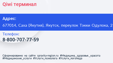 Qiwi, терминал по адресу 677014, Саха (Якутия), Якутск, переулок Тэкки Одулока, 2 в дальнейшем Организация, размещена в следующих категориях: