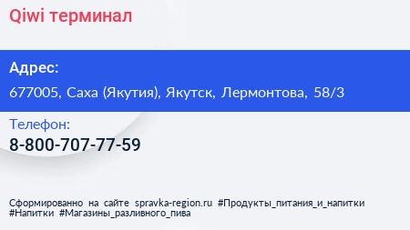 Qiwi, терминал по адресу 677005, Саха (Якутия), Якутск, Лермонтова, 58/3 в дальнейшем Организация, размещена в следующих категориях: