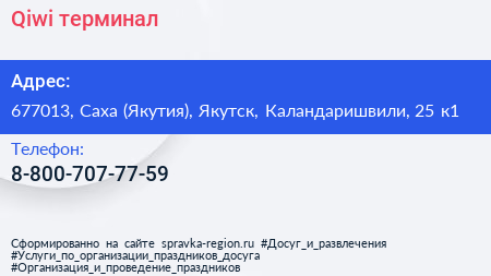 Qiwi, терминал по адресу 677013, Саха (Якутия), Якутск, Каландаришвили, 25 к1 в дальнейшем Организация, размещена в следующих категориях:
