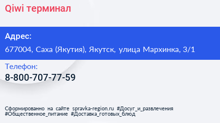 Qiwi, терминал по адресу 677004, Саха (Якутия), Якутск, улица Мархинка, 3/1 в дальнейшем Организация, размещена в следующих категориях: